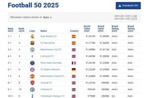 2025最具价值足球品牌:皇马19.21亿第1 巴萨第2 英超big6均前十
