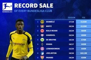 德甲各队卖人纪录:登贝莱1.35亿欧居首,维尔茨1.25亿欧第二