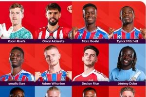 中场:萨尔(水晶宫)、沃顿(水晶宫)、赖斯(阿森纳)、多库(曼城)